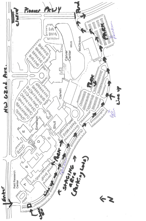 Please enter the lineup at South Dr. off of NW 62nd Ave (Pioneer Pkwy will be closed at NW 62nd). As you enter South Dr. drive up to the Check-In Tent and you will be directed where to find your spot for the lineup.
