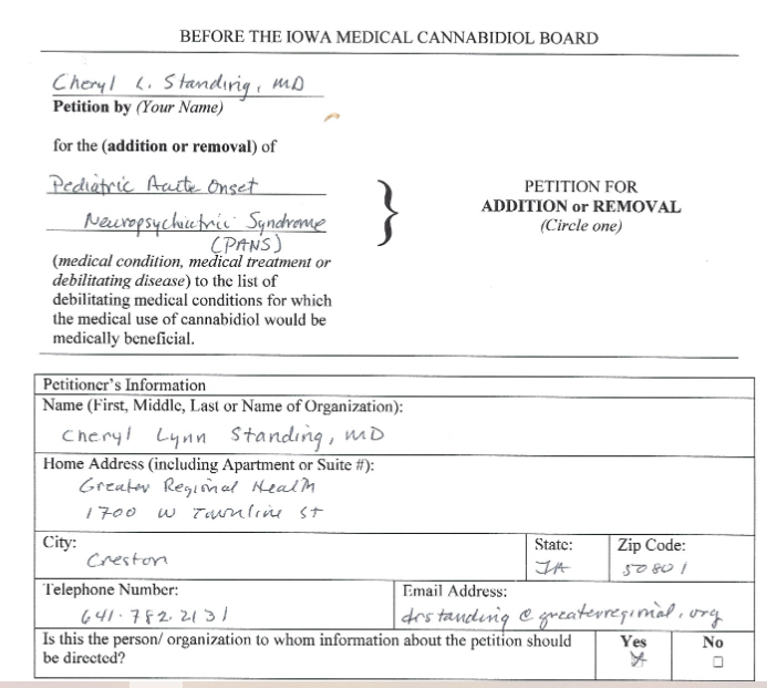 PANS Syndrome, or Pediatric Acute-Onset Neuropsychiatric Syndrome, was not recommended for acceptance by the Iowa Medical Cannabidiol Advisory Board’s 3-panel subcommittee recently. Today, during the meeting on Friday the 13th, all but Dr. Miller and Dr. Stoken voted to deny the petition to add PANS Syndrome to the list of qualifying conditions. Dr. Miller and Dr. Stoken did vote to not deny this petition, making this a split vote by the board.