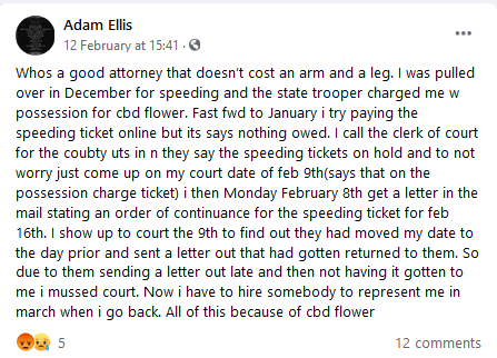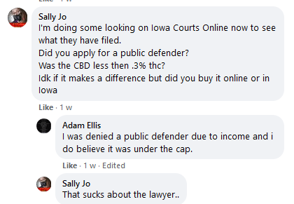The man arrested for possession of CBD flower said on Facebook that he was unfortunately denied a public defender due to having too much income: