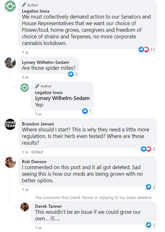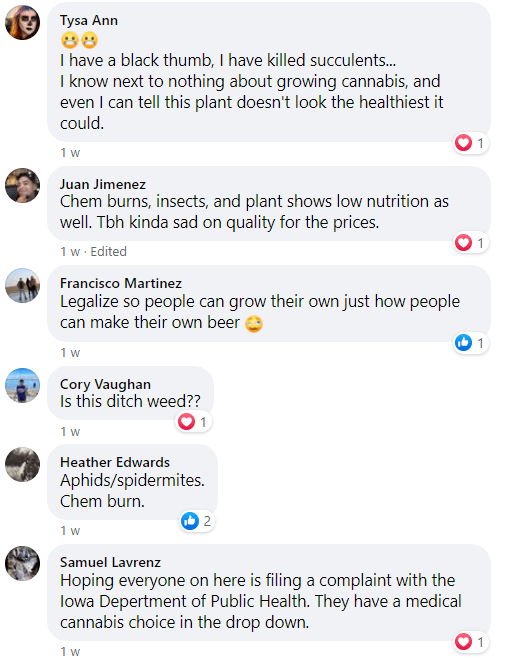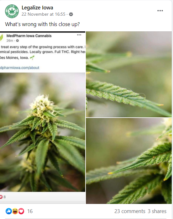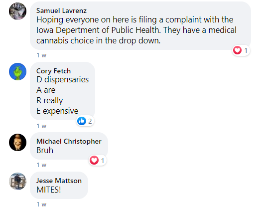 Legalize Iowa dramatically and hysterically imagined on Facebook this NOvember (screenshots below) as well as had calls to action in the comments by their truly evil irresponsible user base to file business complaints against MedPharm Iowa. These baseless complaints (based on a malice and intent to defame MedPharm as Legalize Iowa promotes home grown access over legal access and makes up lies to discredit legal medical marijuana businesses to pursue this agenda) were easily and readily refuted by Medpharm on Facebook the following day. See below: