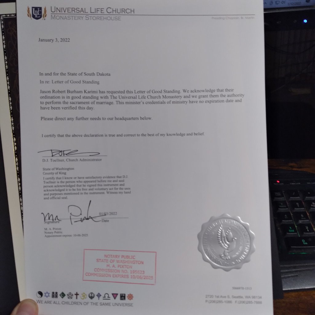 I requested the ULC church send me official documents for court cases. I’ll submit these in my arguments for being allowed to use marijuana at the federal level for religious freedom under the first amendment to the US constitution, the first amendment to the Minnesota state constitution, and the conscience clause of the Minnesota state constitution, which provides greater religious protections than the state or federal constitutions making Minnesota one of the most powerful places in America to stand up for your right to use marijuana in prayer session with personal sacred chalice.