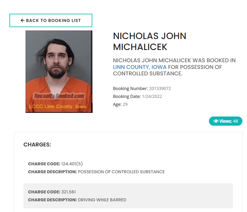 UPDATE: The criminal charges and case citation have disappeared from Iowa Courts Online and are nowhere to be found. However, mug shot booking with the date of the charge for possessing CBD is found here…. https://recentlybooked.com/IA/Linn/NICHOLAS-MICHALICEK~1024_201339072
