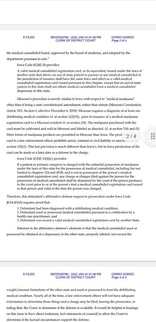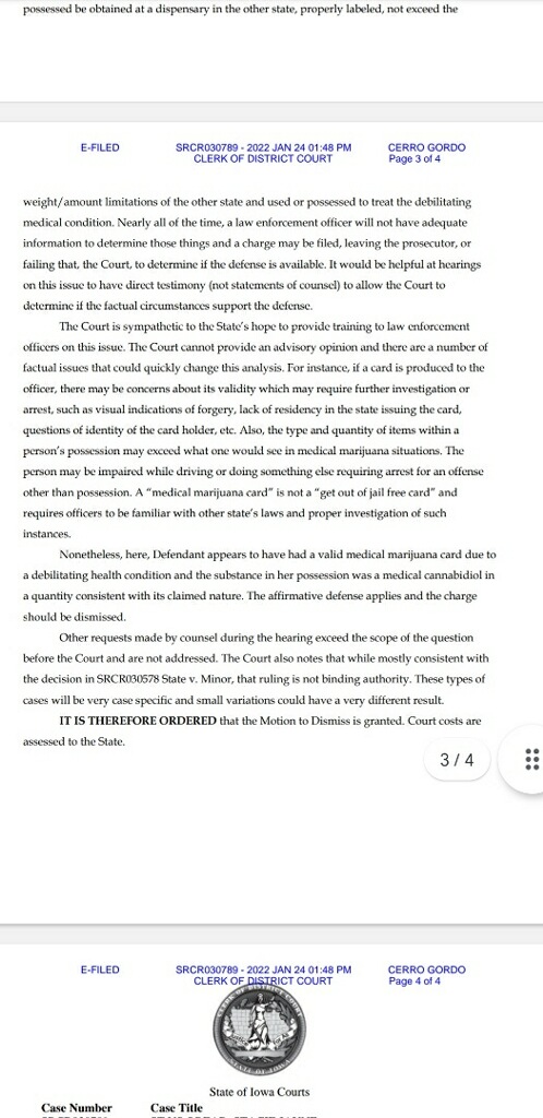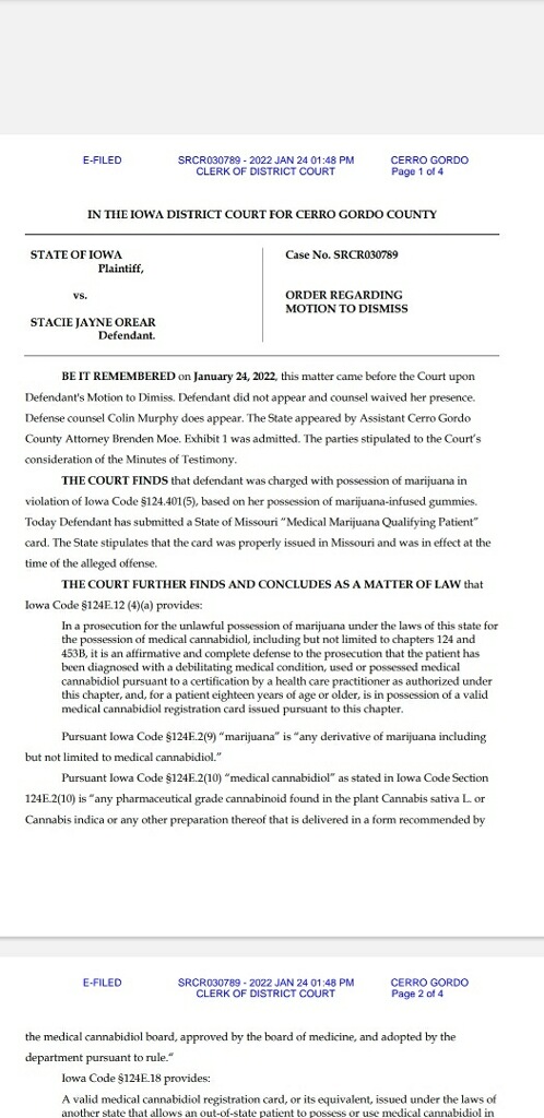 However, as this court ruled, out of state medical marijuana patients can totally possess flower in Iowa. This is a testimony to the shoddy work the Iowa legislature has done on reforming marijuana laws to bring them up to date with modern notions of civil rights and racial equality. Here’s the ruling from January 24 from the Iowa District Court for Cerro Gordo county: