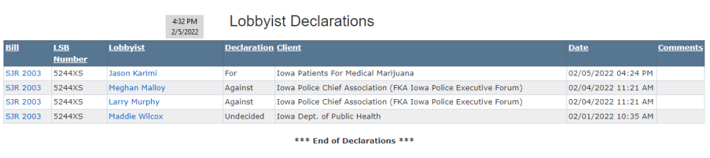 This joint resolution, SJR 2003, currently only has four registered lobbyist declarations, one from Iowa Patients for Medical Marijuana, two from the police chief association and one from the Iowa Department of Health. Police supporting black market drug sales is par the course this year for the most powerful lobbyist organization in the state. Small town drug dealers strongly oppose removing prohibition, which provides no state control over a popular and profitable commodity. Johann Hari’s “The Fix” narrated by Samuel L. Jackson exposes this unseen, corrupted, and unintended, consequence of prohibition for free here on the Roku web player — watch in your browser today.