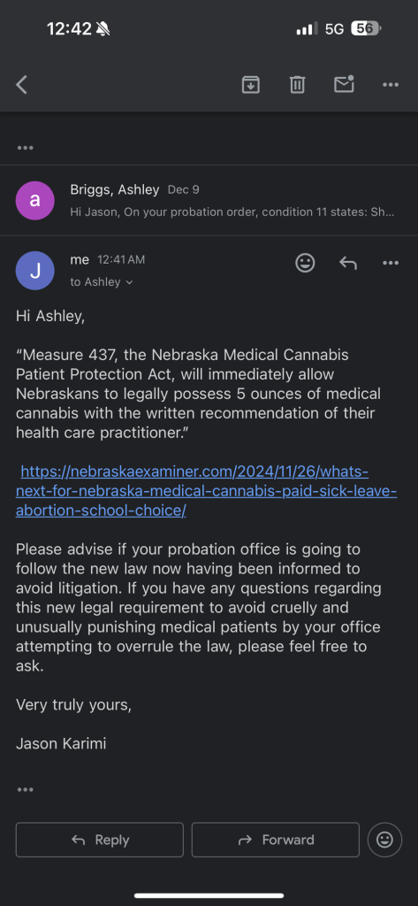 December 30: Recalling my probation officer had told me not to file to see the judge I emailed Nebraska probation the following in an attempt to get an updated implementation policy for probationers following or protected under nebraskas new medical cannabis law that went into effect December 12: