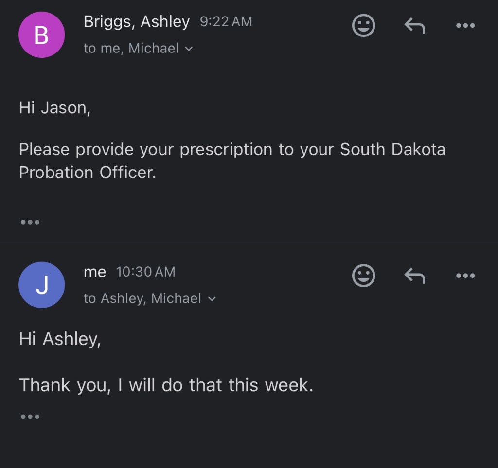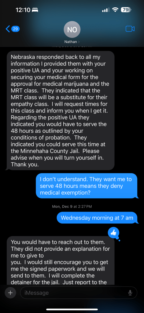 Before leaving my po office Friday the 22nd of November I advised I would request a hearing with the judge. My po instructed me not to request such a hearing and wait first for him to submit my medical marijuana card. My po then advised I needed a separate extra letter from my doctor violating hipaa outlining my private medical conditions an ethical dilemma addressed as a concern by the November 2024 report from the South Dakota medical marijuana oversight committee. As I left the office I called Nebraska clerk of court asked how to file a request for a hearing emailed a request per the clerk instructions.