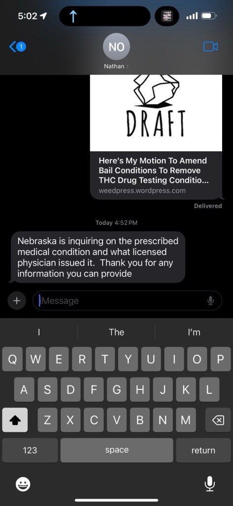 October 22nd: state probation first meeting probation officer advised Nebraska probation was not allowing my active med card as an exemption. I advised I would file for a religious exemption with Nebraska to use federally lawful hemp so as not to be a federal criminal with medical cannabis.