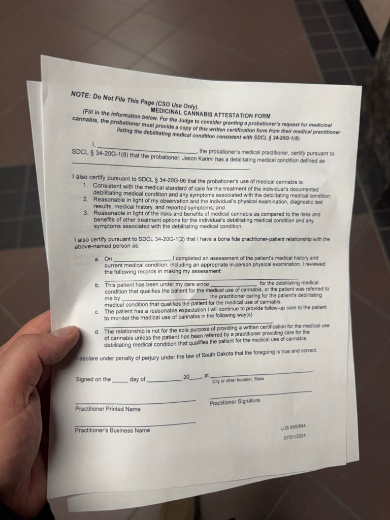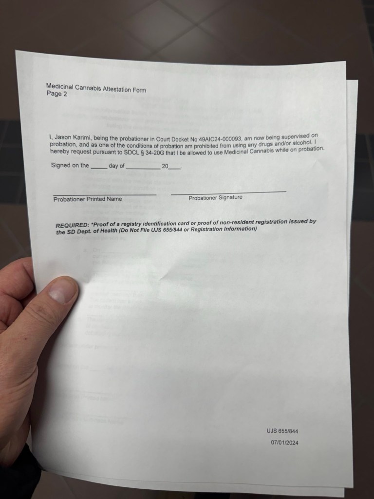 Sent po draft today at 7. Went in to drop at 10. Told him I needed an injury, or else my med card won’t get renewed in a month and be blocked by probation. He said ok it says you have to go to jail immediately. Told him hemp thca used yesterday. I then said if you send me to jail before seeing a judge I will file suit immediately and need a hearing. He said ok hold on. Jesse called said he will sue the po said calm down everybody no need for lawsuits do you have your med card with you I said here you go he photocopied it and said I can leave he will be in touch and he will call Nebraska to see what they want to do and if my med card will exempt me as he knows South Dakota law allows that to happen