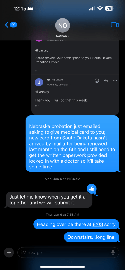 March 8: met with po no ua given wrote this text upon leaving “Probation today: took my new medical card asked how getting the probation paperwork signed was going to dem he’d give me a month to get the paperwork signed by a doc to quote in his words “keep Nebraska from breathing down our neck and leave us alone”