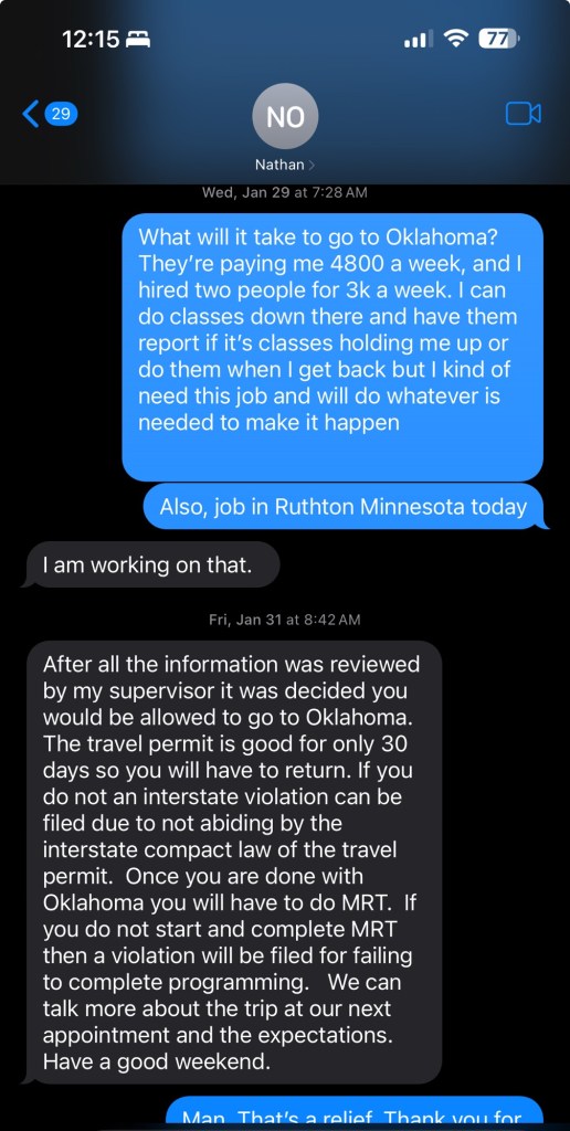 Friday November 22nd: at 7 am in writing wrote probation officer the following via text: