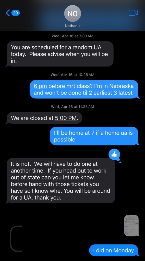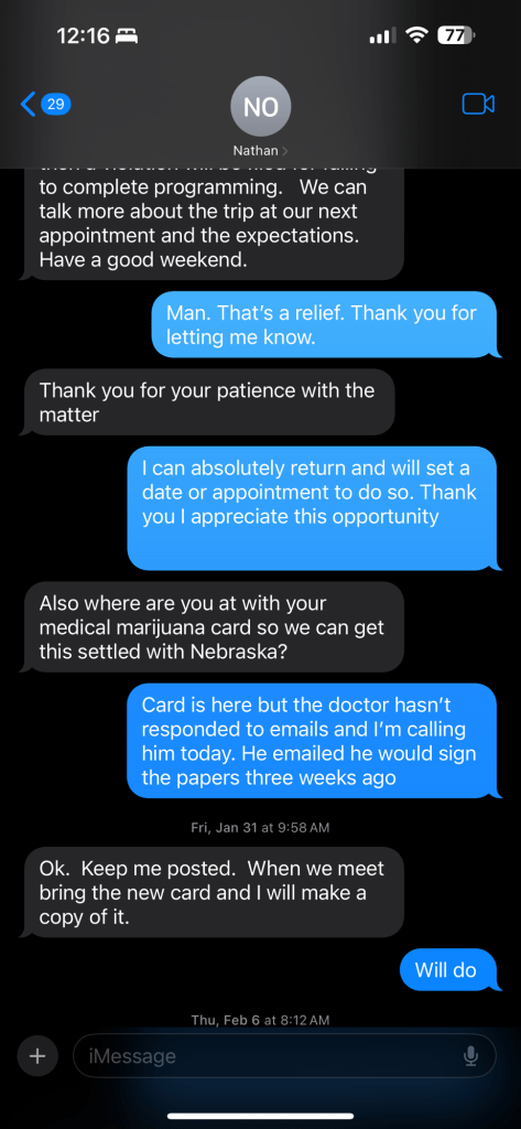 Today: po five minute meeting dropped dirty advised haven’t been consuming he said what’s this about an email to Nebraska I explained he said I won’t send this ua in either sounds like they’ll allow it he’s going to ask if med card is sufficient I advised likely they need a written recommendation and that’s being filled out this week and the doctor clinic has the paperwork to fill it out and promised in writing they would” adding on, he said he was going to send in ua to lab until Nebraska emailed him and said they’re going to now accept my med card he expressed surprise that the Nebraska probation had advised him of this given they had previously advised they would not allow medical cannabis exemptions; as my ua had thc, po said he was planning on sending ua into the lab but would dump it out instead as he’s not going to penalize or charge me money if Nebraska is going to approve medical thc exemption and to have a nice day I wasn’t dropped again for any uas for five months through June 2025
