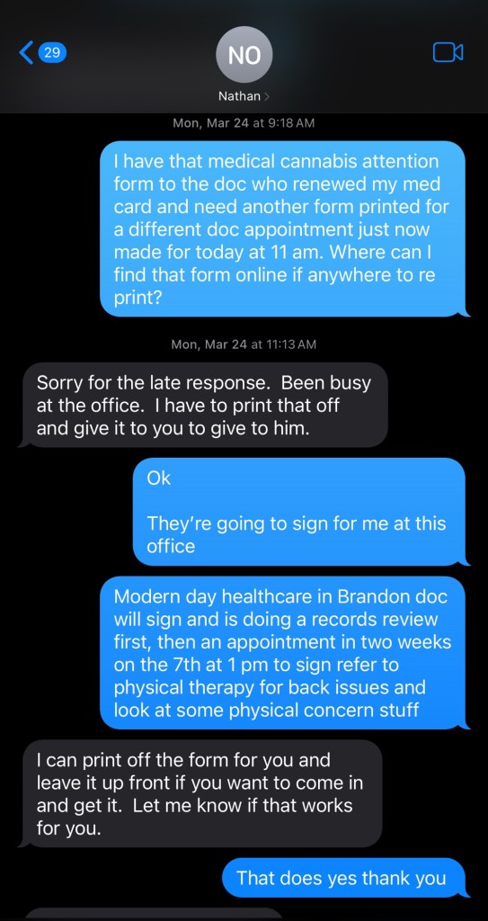 march 24: text po for new med exemption form for probation as I was switching doctors as prior doctor would not sign probation paperwork die to concerns with not being a legal expert on federal and state complex laws and wanting to be extra safe for his practice so I switched doctors