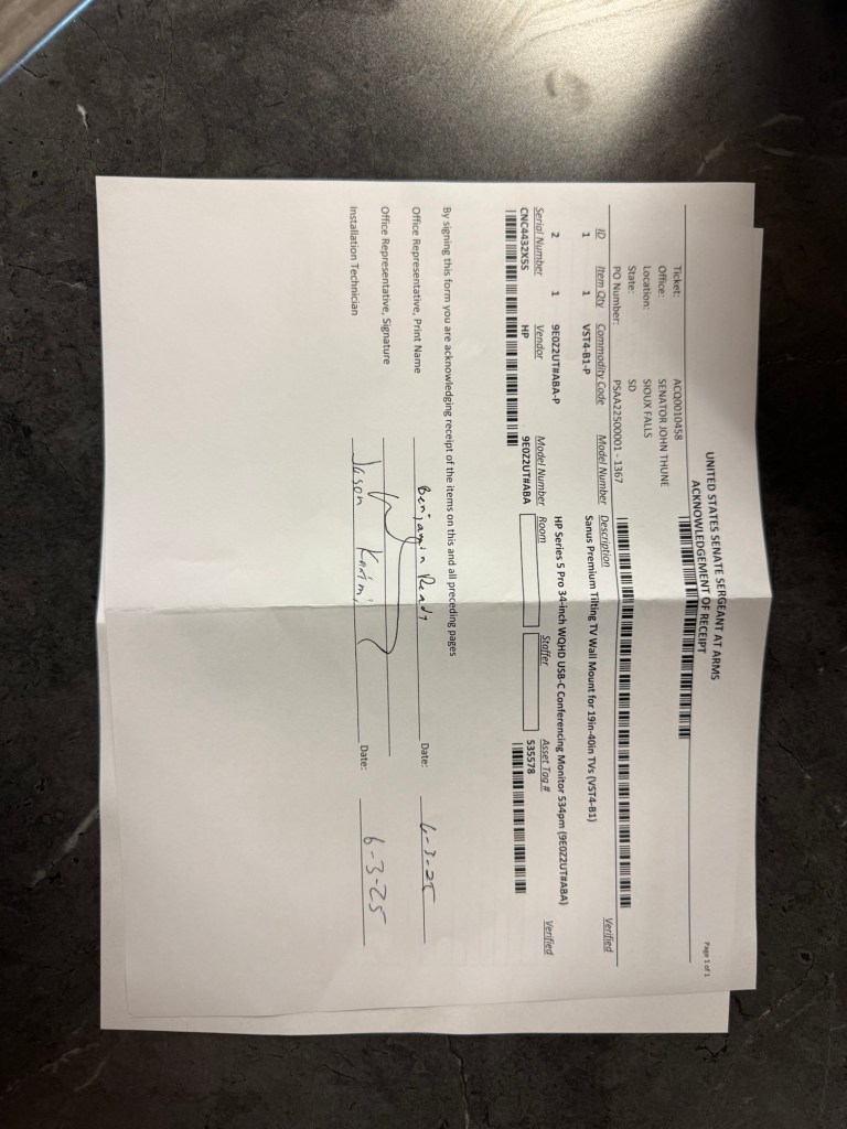So to that end while installing a TV at this office I left the following note with Senator Thune. Next stop: DEA offices.
