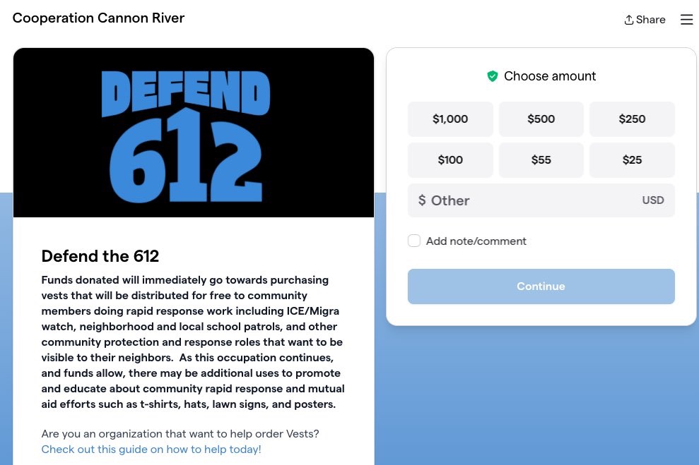 When you go to their donate page, you learn that “Defend the 612” is really just a DBA for “Cooperation Cannon River.”