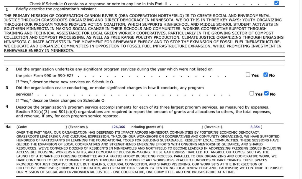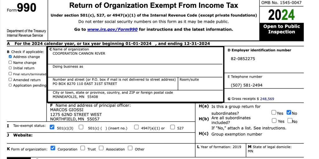 If you want to go further, Cooperation Cannon River (EIN 820852275) has Marcos Giossi as Board Chair, who also is a board member on LINE 3 LEGAL FUND (EIN 862254861). Could see what’s under that rock…