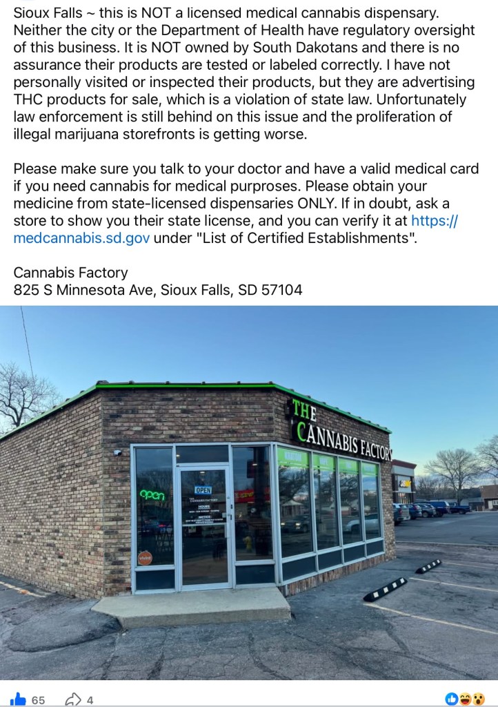 But South Dakota law does not recognize unlicensed cannabis dispensaries.