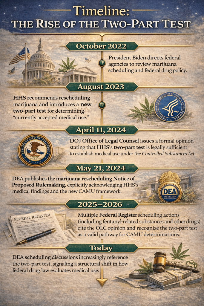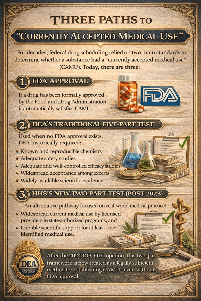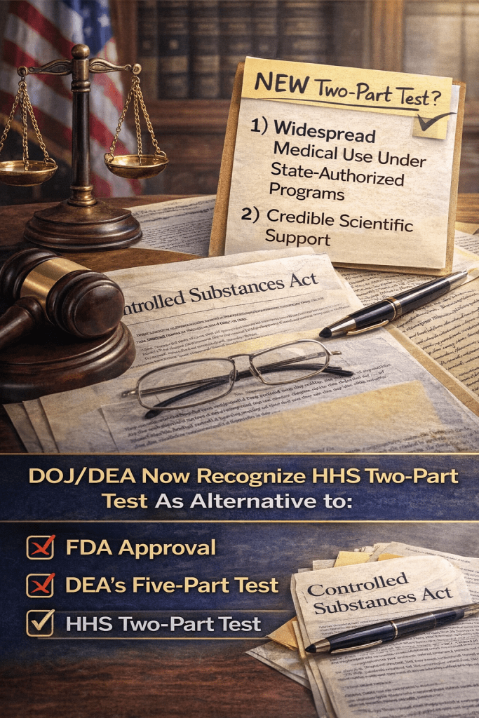 But the legal landscape has shifted significantly in the past few years. A combination of new Department of Health and Human Services (HHS) criteria and a key Justice Department Office of Legal Counsel (OLC) opinion has given the DEA — and federal rulemaking — a new way to satisfy the “currently accepted medical use” test, even when FDA approval and the five-part test are not met.