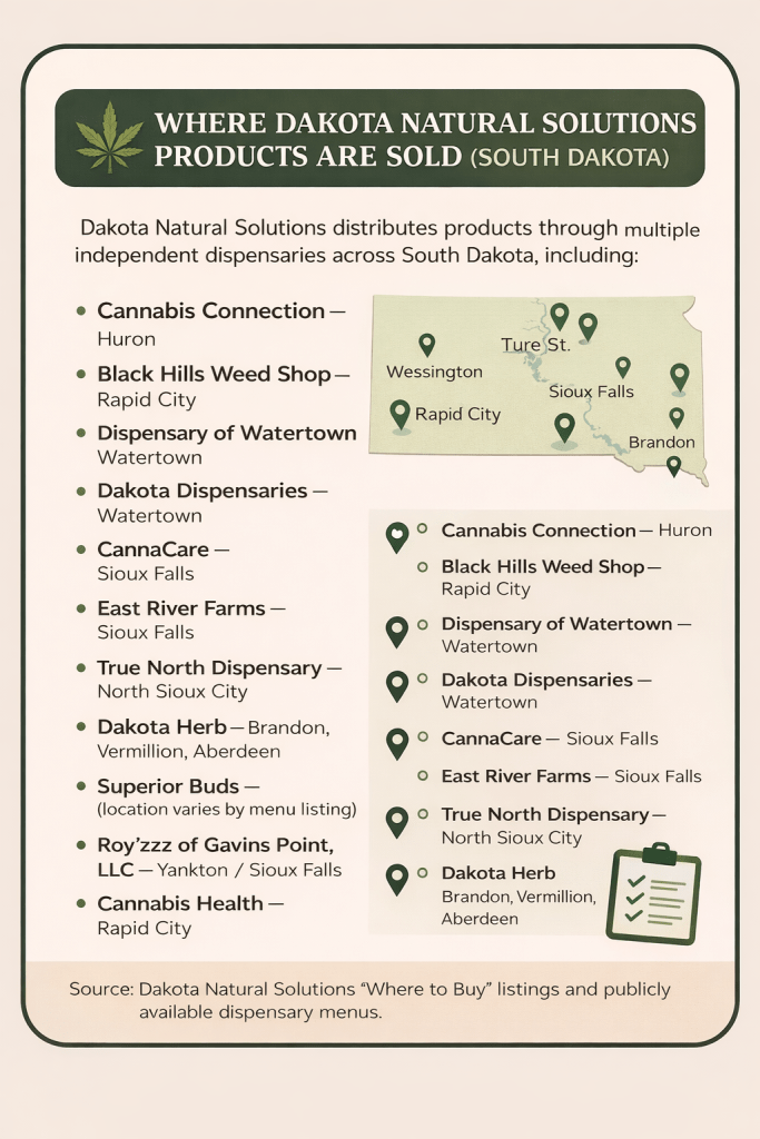 According to Dakota Natural Solutions’ official retailer listings and live dispensary menus, products from Dakota Natural Solutions Industries LLC are sold through multiple independent dispensaries across South Dakota, including: