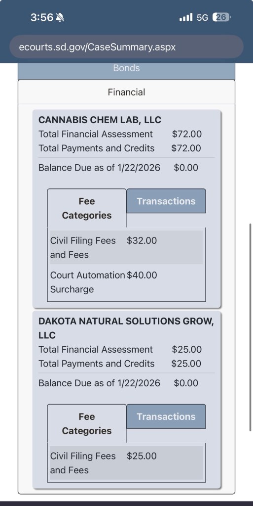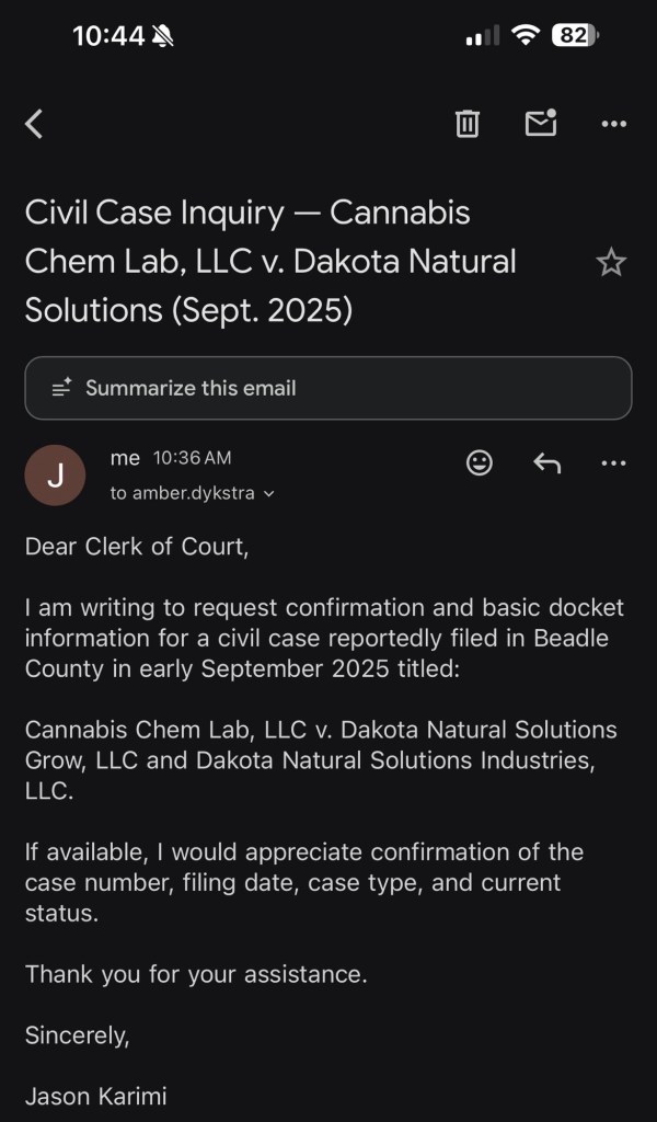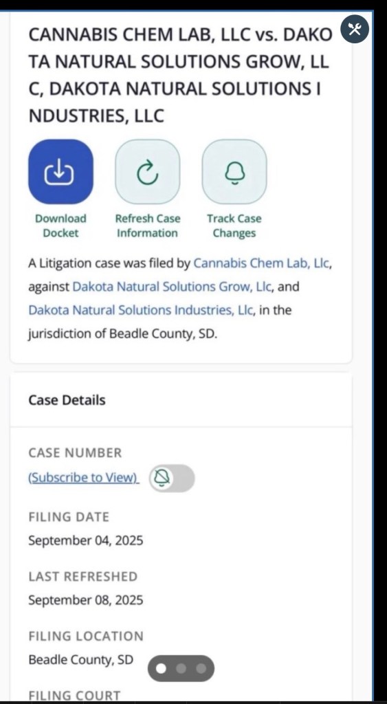 Bradley County, South Dakota court officials have confirmed that Cannabis Chem Lab, LLC v. Dakota Natural Solutions is an active civil case filed September 4, 2025 (Case No. 02CIV25-000228). The docket reflects no recorded updates since October 9, 2025, indicating the matter remains unresolved or inactive at this time.