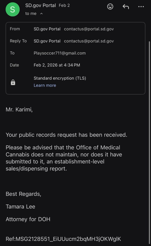 As South Dakota lawmakers continue debating cannabis enforcement and market controls, a public records response from the Department of Health reveals a key data gap at the center of the state’s regulatory framework: the Office of Medical Cannabis does not collect or receive dispensary-level sales or dispensing reports.