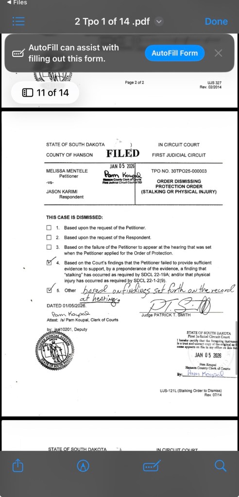 Today, a South Dakota court dismissed—again—a temporary protection order petition filed against me by Melissa Mentell. It was the third attempt with a third judge in a matter of weeks to persuade a judge that my public writing and criticism of her policy positions constituted harassment. For the second time, the court rejected that claim as legally unsupported.