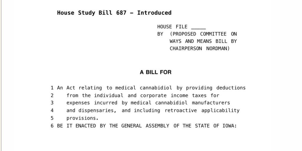 Iowa lawmakers have introduced House Study Bill 687, a tax measure that would let licensed medical cannabis manufacturers and dispensaries deduct ordinary business expenses on their Iowa tax returns even though those same deductions remain blocked at the federal level under Internal Revenue Code section 280E. As of March 4, 2026, the bill was scheduled for a Ways and Means subcommittee meeting on March 10, 2026 at 12:30 p.m. in Room 304.