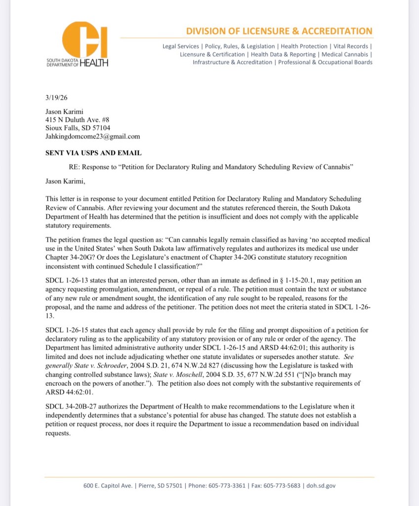That is actually important, because the original petition squarely asked them to decide whether cannabis can remain Schedule I when South Dakota affirmatively regulates medical use, and to issue a final ruling subject to review. Their response avoids that merits question and instead narrows the fight to agency power and procedure.