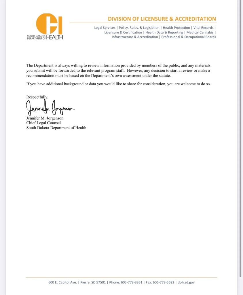 ⁵ S.D. Codified Laws § 34-20B-92 (providing judicial review of final determinations, findings, and conclusions of the Department under chapter 34-20B). The Department’s letter takes the position that no citizen-triggered petition process exists under § 34-20B-27.