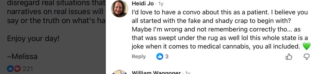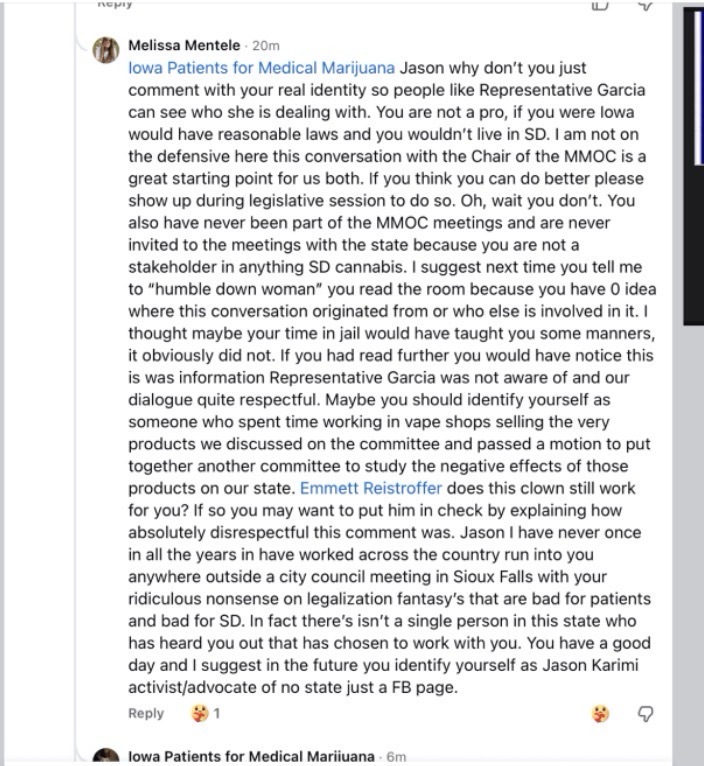 Issues originally brought up by other cannabis advocates in South Dakota like LeeAnn Tall Bear in public comments were reported at my blog, and Melissa responded not by dialogue, but instead Melissa (“Mel” as she likes to present herself on her public lobbyist pages she runs) launched a campaign of threats, harassment, and lies to damage my reputation and work on fixing federal laws.