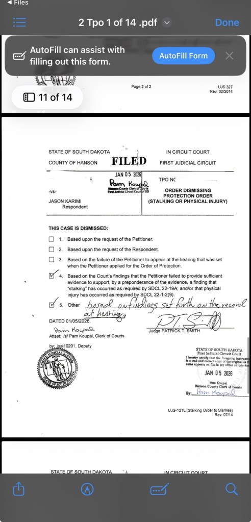I will have more to say in time about the full sequence of events and what it cost to defend against this. But for now, the central fact is simple: the misdemeanor case against me was dismissed on February 12, 2026, and the matter is over.