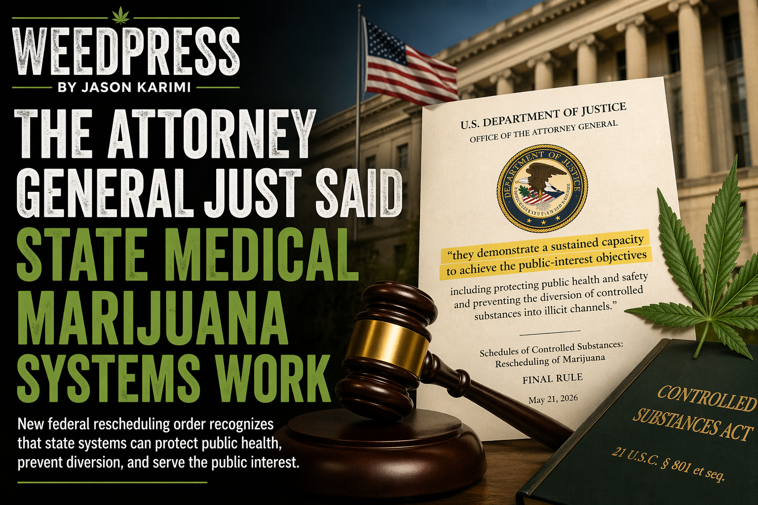 April 24, 2026 The most important sentence in the new federal marijuana rescheduling order may not be the word “Schedule III.” It may be the Attorney General’s finding that state medical-marijuana systems, “taken as a whole,” have demonstrated a “sustained capacity” to achieve the public-interest objectives behind the Controlled Substances Act’s registration framework: public health, … Continue reading The Attorney General Just Said State Medical Marijuana Systems Work